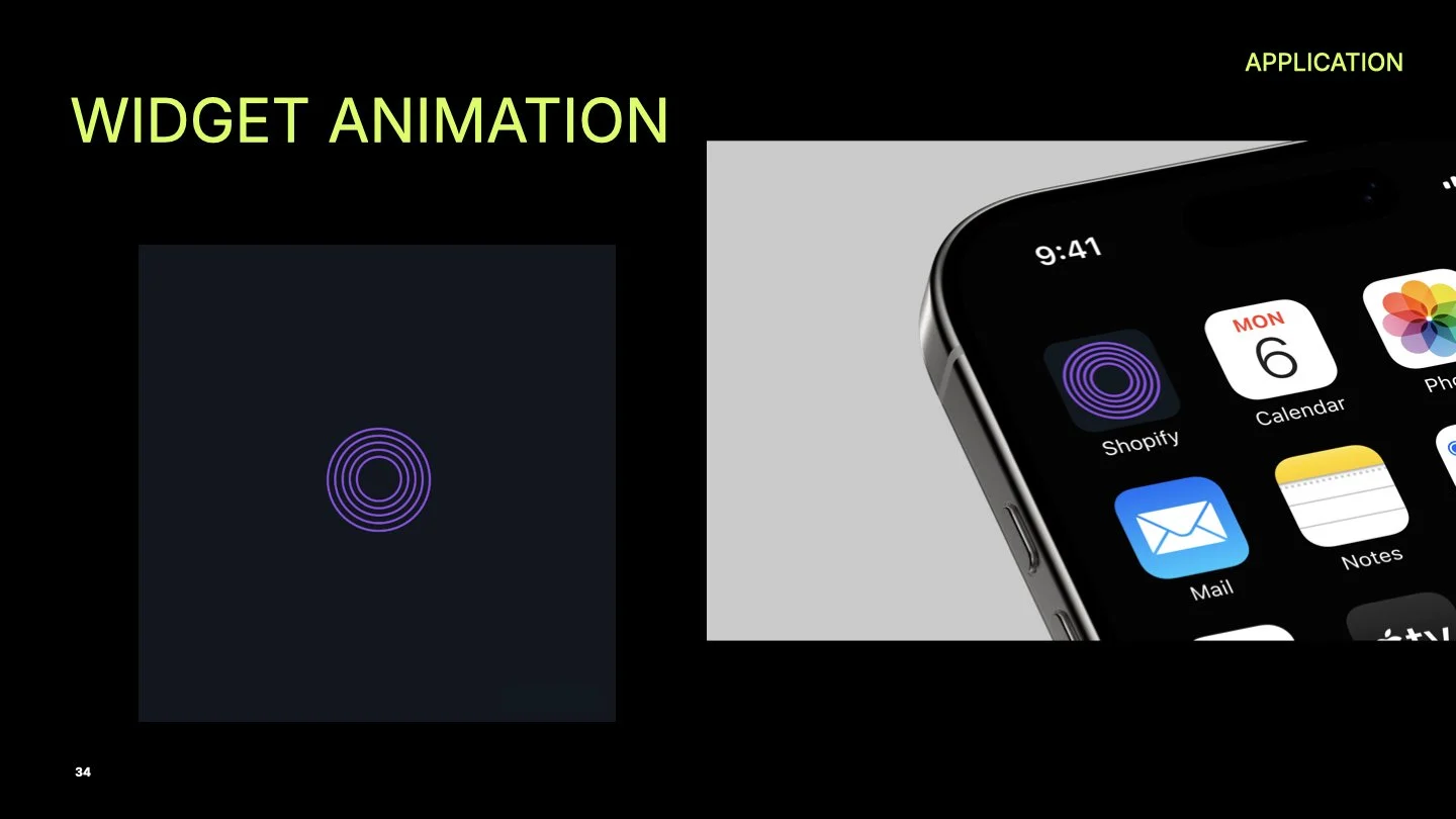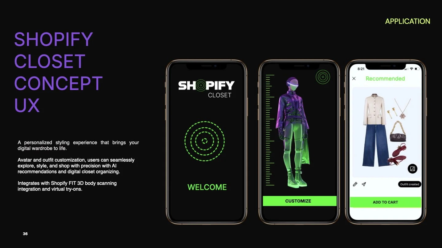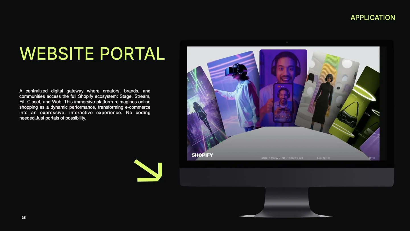 One of the focal points of the project was the Shopify logo redesign. The green shopping bag icon felt outdated and not connected to an immersive shopping experience. This led to a variable Shopify logo system, engineered to morph subtly based on the specific tool (e.g., Shopify Fit, Closet, or Stream), allowing for ecosystem cohesion without losing individuality. I also built a visual language around digital sonar rings that guide users through interaction zones, inspired by concert soundwaves and spotlight tracking.
