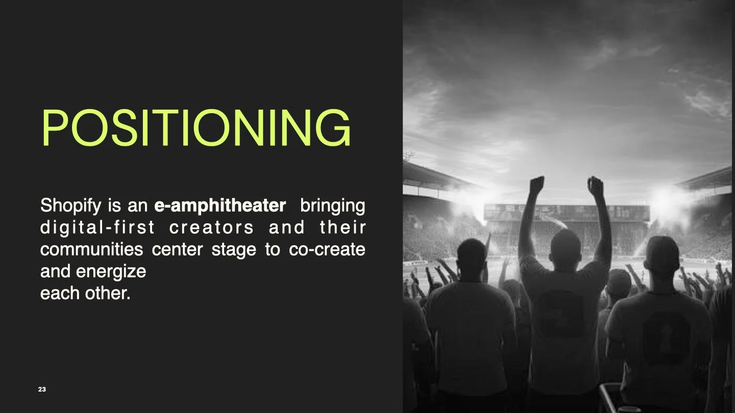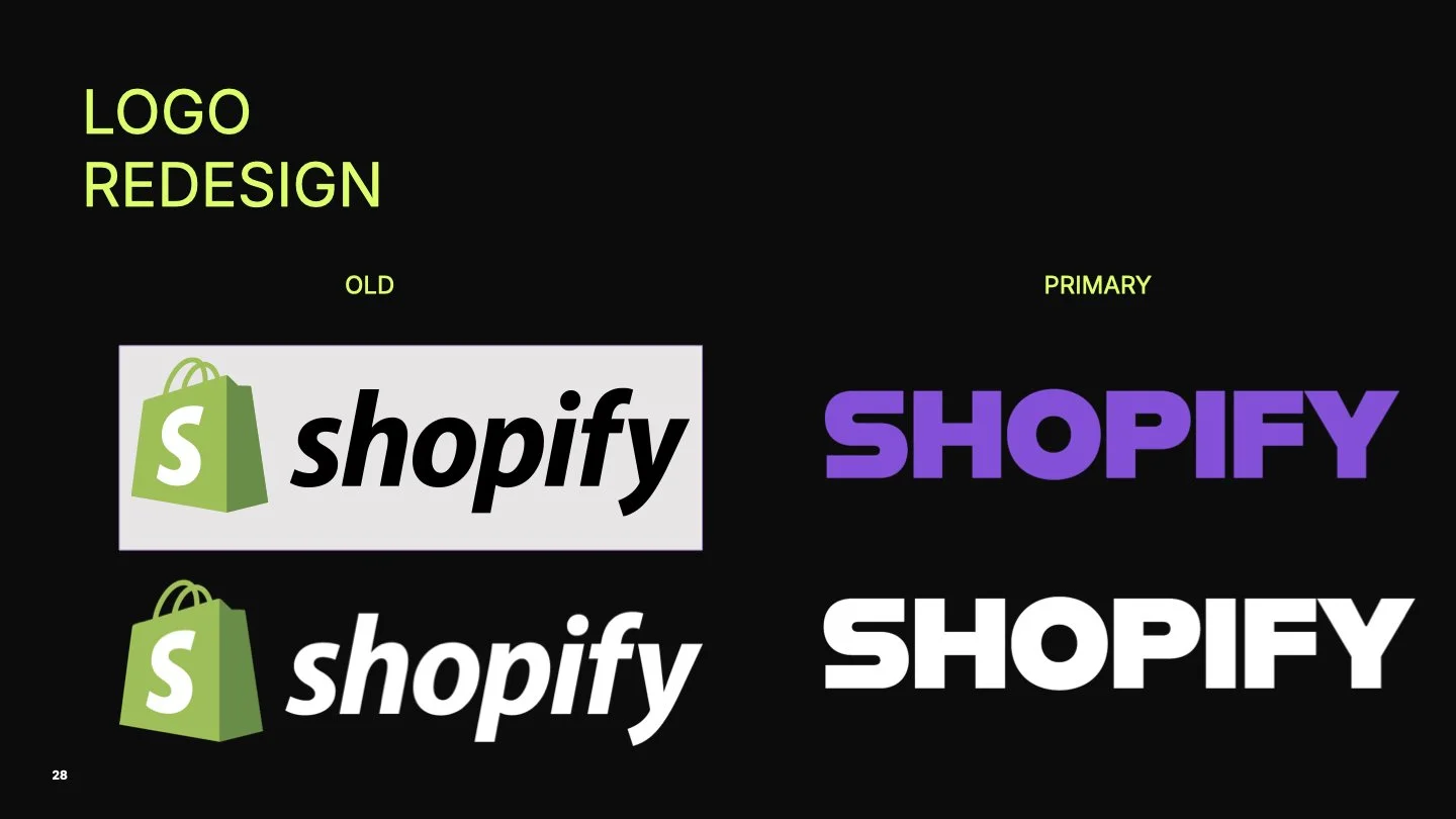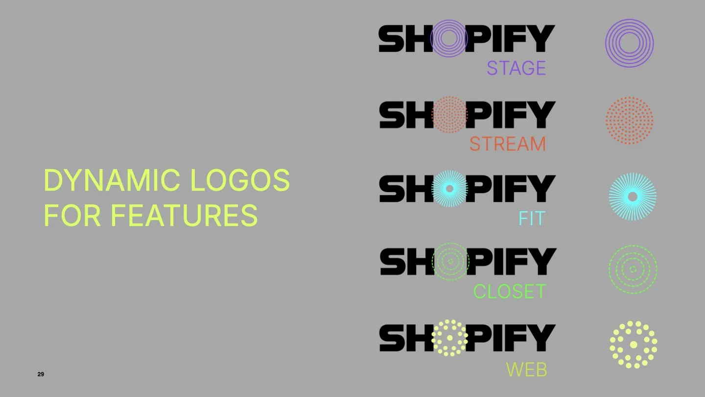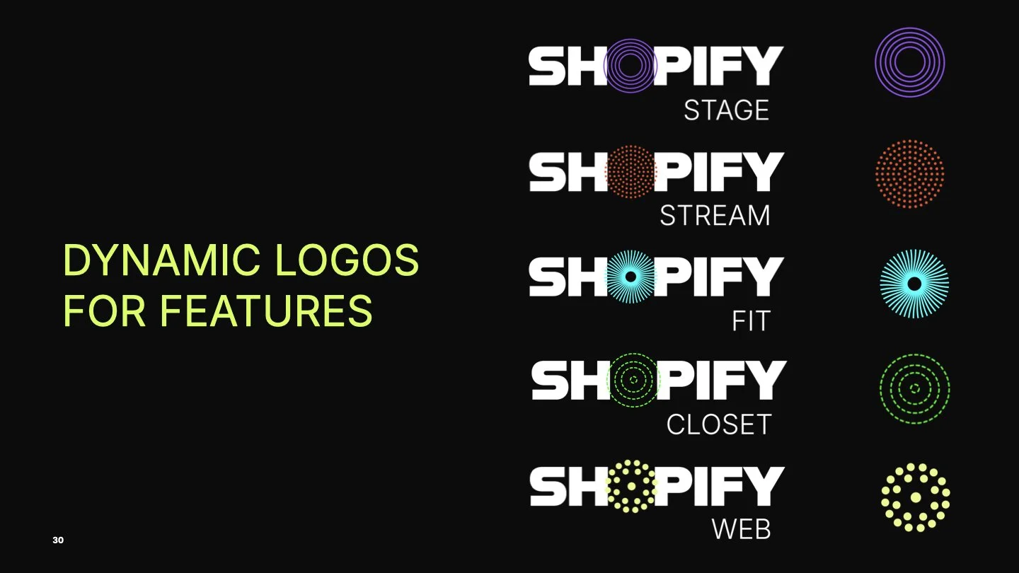 Focal Point: I designed a variable logo system to match the expanded ecosystem of tools, based on competitive analysis, that positions Shopify as an innovative leader with the advent of new technology in AI and mixed reality space.