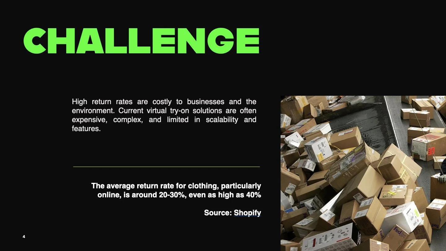 Challenge: The average return rate for clothing, particularly online, is around 20-30%, even as high as 40%. High return rates are costly to businesses and the environment. Current virtual try-on solutions are often expensive, complex, and limited in scalability and features.